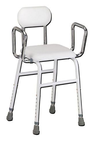 White * Stool features a padded seat and back for added comfort * Angled seat makes sitting on/getting off easy * Manufactured with chrome-plated steel for an attractive durable finish * Comes with removable arm supports with adjustable width for added s